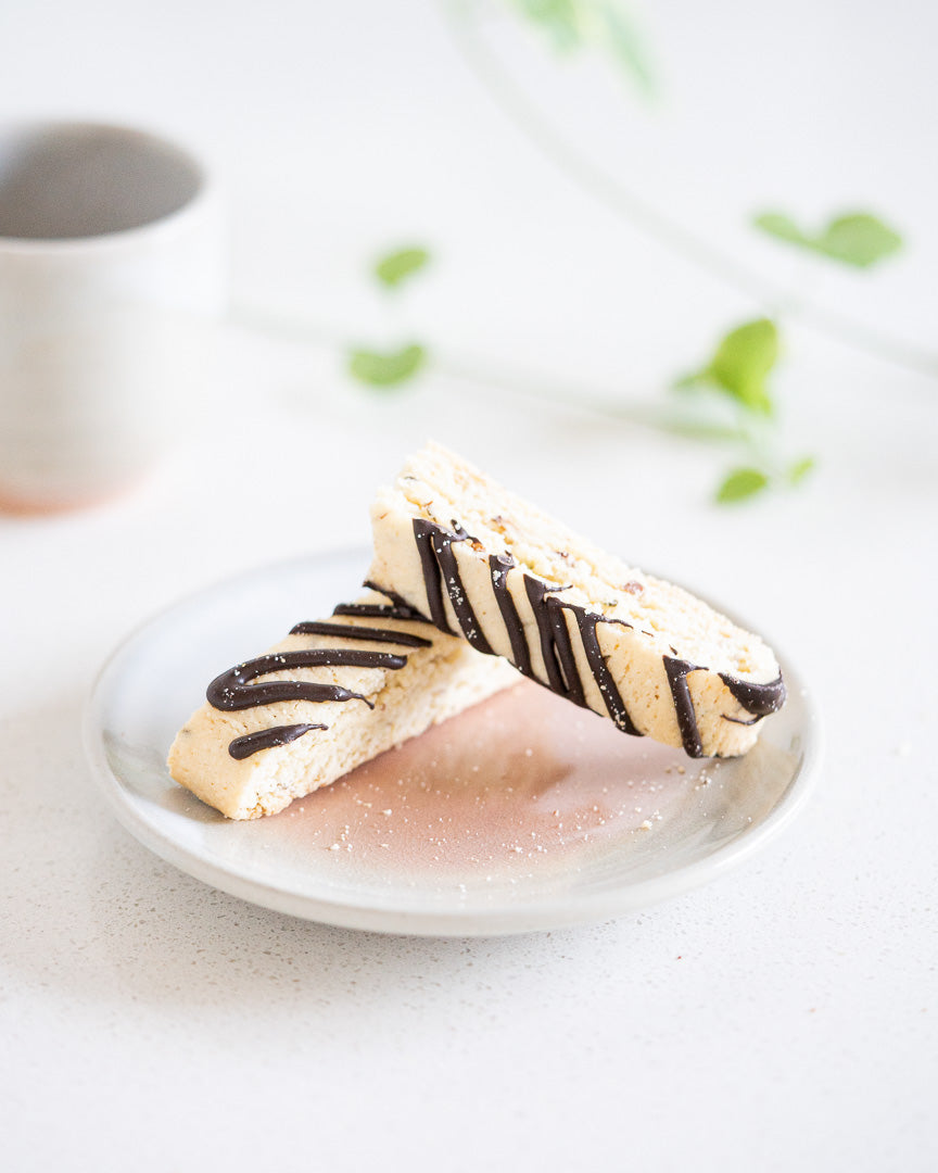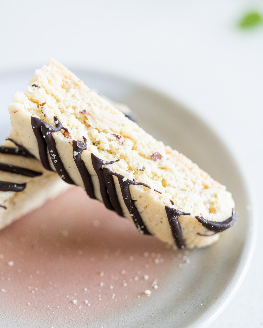 "Biscotti" means twice baked and originated during the days of the Roman Empire when they served as food for travelers and soldiers. Often made with almonds, our version is dressed up with a Galiano liqueur, anise seed and dark chocolate drizzle.