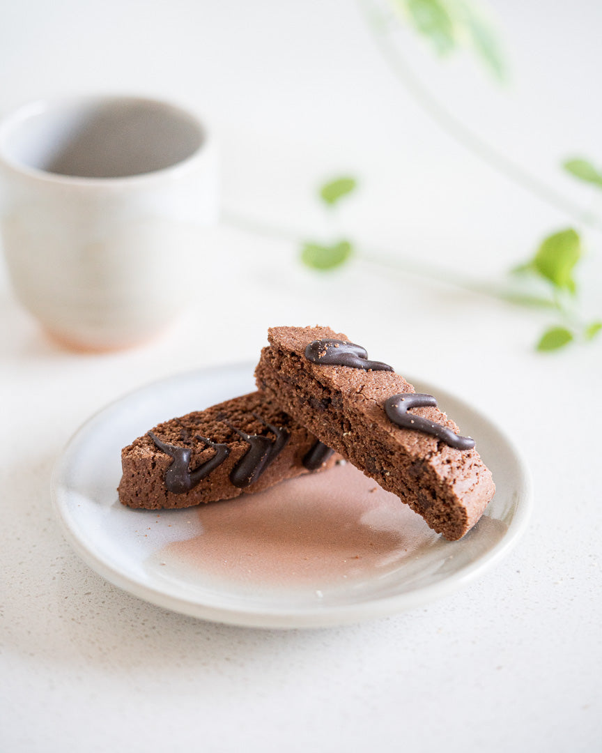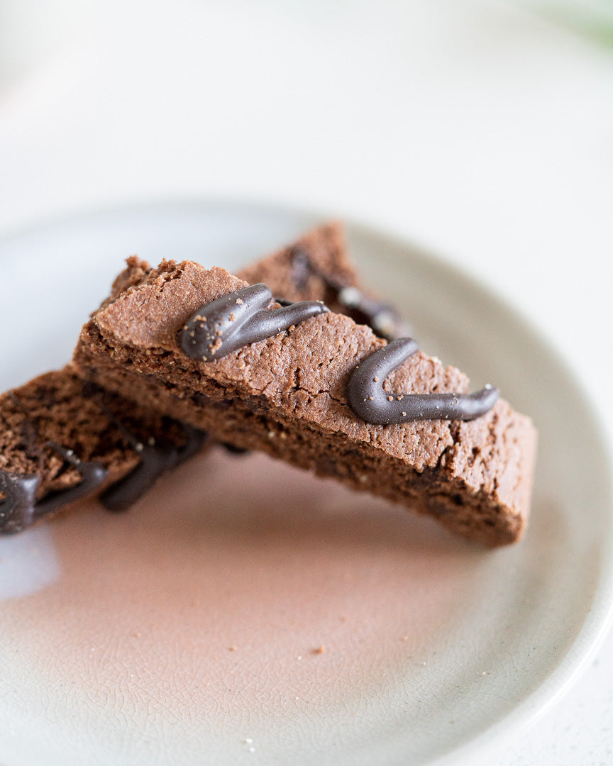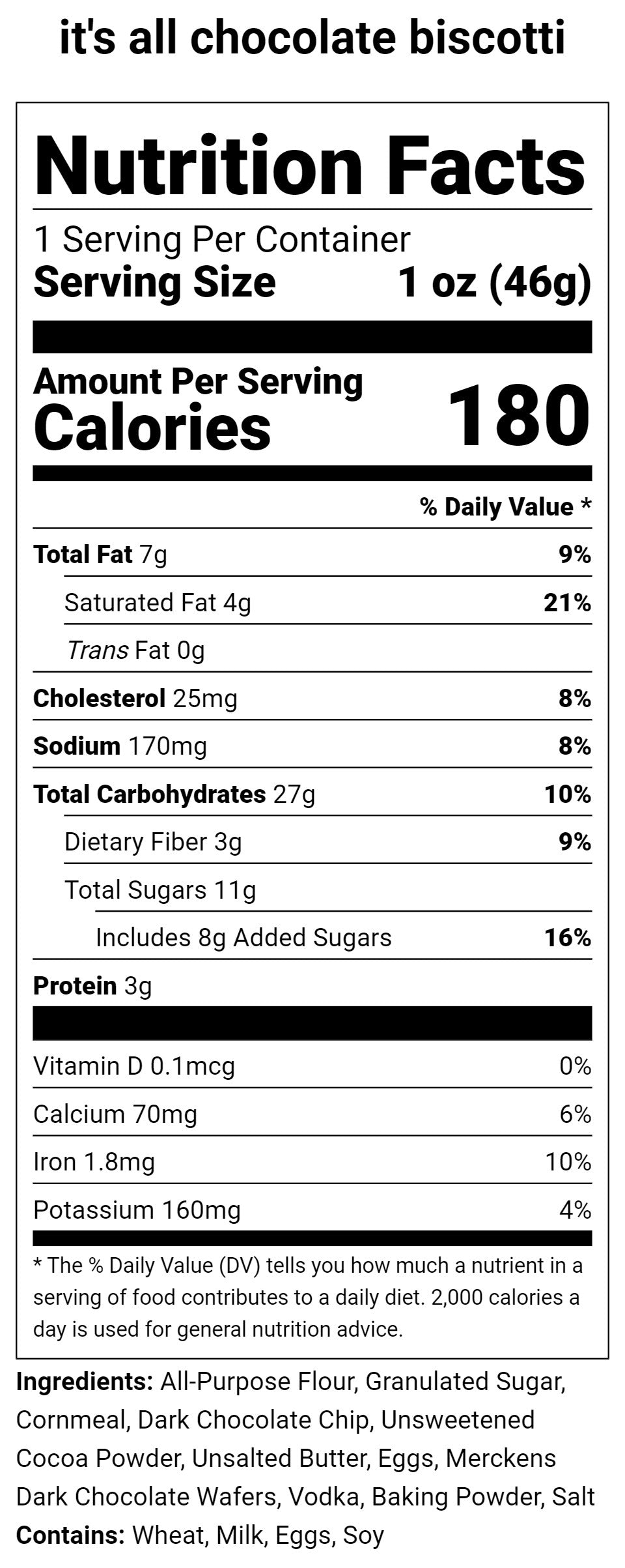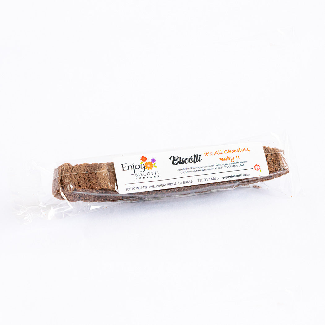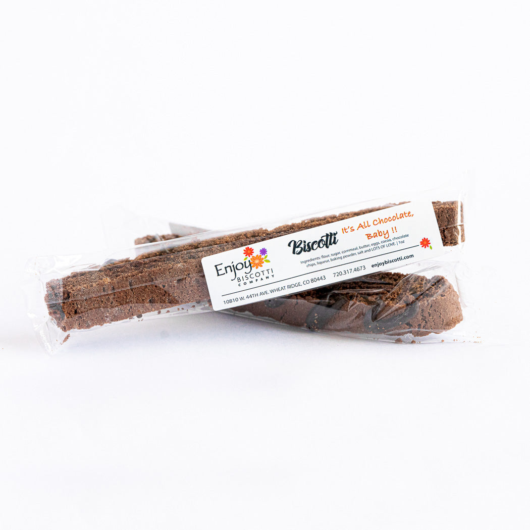 Experience pure chocolate bliss with "It's All Chocolate, Baby!" biscotti. Handmade with rich chocolate chips, dutch cocoa and chocolate liqueur, then dark chocolate drizzled to make these cookies a chocolate lover's dream. Savor the indulgent taste of these biscotti with your Americano or your evening aperitif.